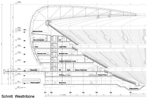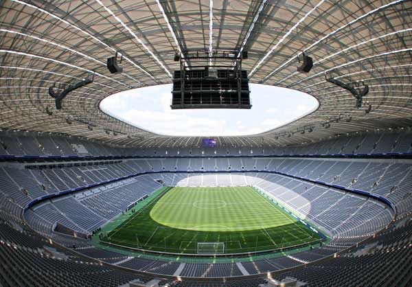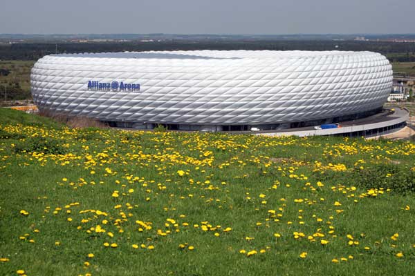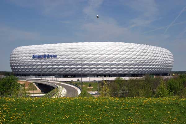 德国慕尼黑足球俱乐部拜仁慕尼黑和慕尼黑1860将启用新的足球场Allianz Arena,这个足球场由瑞士的建筑设计师Jacques Herzog 和 Pierre de Meuron 设计(Jacques Herzog曾在苏黎士联合工业大学接受教育并在那里遇到了Pierre de Meuron。他们共同于1978年在巴塞尔(Bale)建立了Herzog & de Meuron建筑事务所。Herzog & de Meuron建筑事务所在伦敦、苏黎士、巴塞罗纳、旧金山和北京都有分支机构。)2001年他们获得普里策奖。 足球场整个外围用光滑可膨胀的ETFE材料(ETFE的中文名为乙烯-四氟乙烯共聚物。ETFE膜材的厚度通常小于0.20mm,是一种透明膜材)做成,并可以发出不同的光,红白或是蓝白的菱形让整个建筑看上去是一个LED大屏幕,透亮的顶看上去和体育场的墙壁分开。
