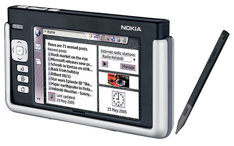 Nokia近期发布了一款非手机功能的手持产品Nokia770,这台手持终端产品虽并不具备手机功能,不过可以通过无线局域网上网冲浪,Nokia称这台机器把许多新概念融合在了一起,它的小体积便于携带,同时硬件强大可以完成许多工作,娱乐功能也很强大。它的操作系统是Nokia Internet Tablet 2005版(基于Linux),处理器为TI OMAP CPU,64MB RAM的内存,支持MMC Slot存储卡,支持Bluetooth和WiFi无线局域网,重量230g。4寸的屏幕支持分辨率800×480象素。价格350美元。