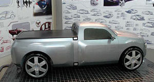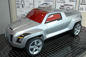Michael Gillam设计的想法很新鲜,他的卡车顶、巨型护栏做得很有特点,让人看上去马力十足。他把车兜的护栏做得很大,主要是想把车兜底部承载的重量分担一些给护栏,让车兜可以做得更深承载更多的东西。护拦做成银白色让人能轻易分辨出汽车每部分的构造,还与驾驶室的黑色形成搭配。银白色在设计汽车的前端排热栅和前灯的时候又一次被用到,达到了汽车前后都是银白色的效果。排热栅和前灯都做成方行,体现出了卡车雄壮的本性,同时也保持了整个车子的格调一致。最有趣的是排热栅中间的部分和三角形的车头。用来分开乘坐室和车兜的是一块拱形板,由于是拱形的,前面的乘坐室空间就大了些,安全性也提高了。但这样的设计有点没把握好全局,车兜的空间也被占据了。