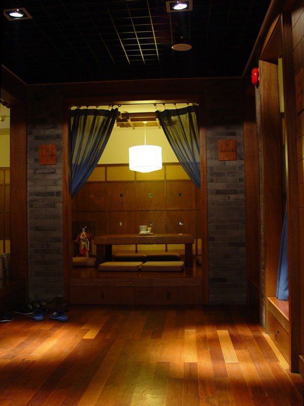 在材料上,主要采用柳安木、杉木和胡桃木等木材,配以锈石、青石、青砖等石材来营造一个安逸、休暇的空间,进而对室内空间环境加以升华,赋予其个性、情趣、格调和气氛。从而突出了青藤茶馆作为高品位的茶文化消费与休闲空间的内在特征,满足人们对高质量精神空间的需求。