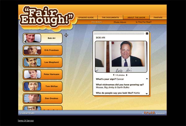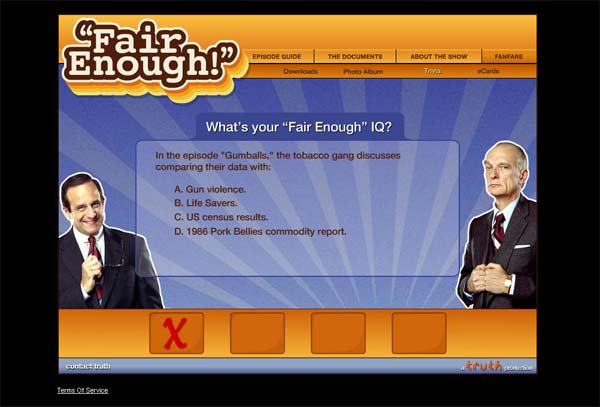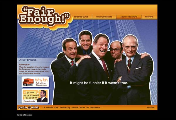 网站的核心是一系列的60秒讽刺性小节目,这些节目使得日常的大型烟草公司的幕后操作被亮化。网站不仅仅停留在用影视的方式去讽刺大的烟草公司,还提供了概览和到其他的链接:额外箴言,小版块,一系列讽刺性的e-cards的下载,音乐以及桌面版的 the Laugh-O-Matic studio audience。我们有一点抱怨就是:我们没有看到一个返回首页的链接。真的是太遗憾了,因为这是一个好网站。