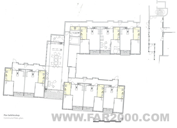 设计特点:凡托夫特养老院的结构宛如一个乡村,建筑群沿着社区弯曲的轴线而建。入口处是乡村广场和养老院管理处,往西有3幢二层的公共住宅和六个病房区,每个病房区有10间病房和一个公共活动室;往东有48套供服务人员使用的两室公寓,最东边是8套为重症残疾人使用的住房。整个建筑群呈扇形面朝南方,并设有户外场地。而公共住宅区拥有相对独立的户外活动场地并带有可燃篝火的群体活动空间。其设计特点是在平面上形成多个疏密适度的半围合式公共空间,但又各自独立。