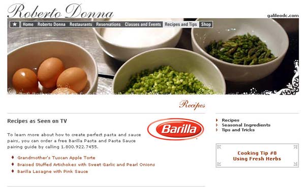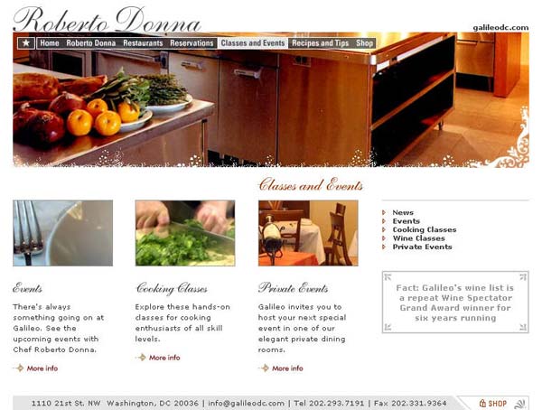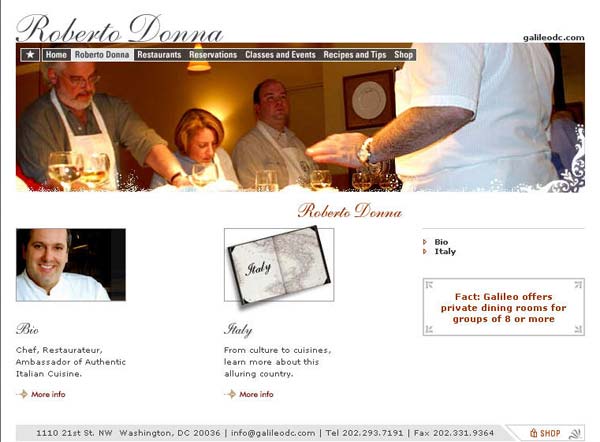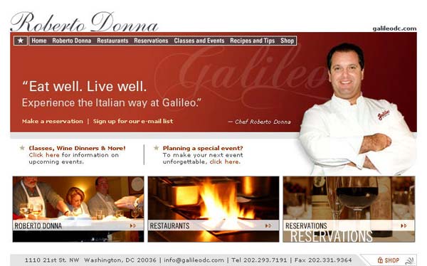 这个站点利用厨师Roberto Donnas 已有的品牌, 把它现代化并且将其带入了网络。它提供了关于厨师和他的两个餐馆Galileo和Laboratorio的详细信息。面向的观众包括新的和现有的顾客,出差者和活动的策划者。