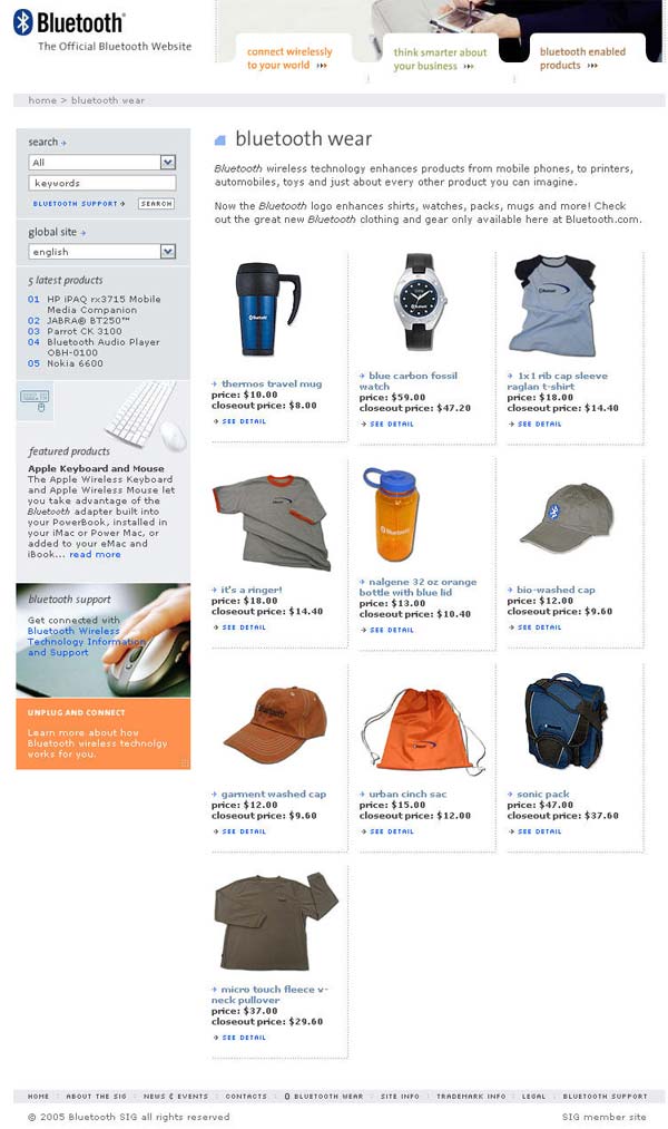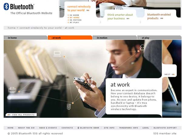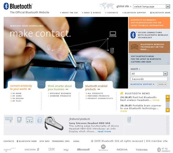 “蓝牙”网站主要目的是展示他们的产品,这些产品背后的技术,同时对访问者进行关于“蓝牙”和无线网络技术的教育。网站的主要观众是消费者,但同时也包括“蓝牙”技术合作伙伴和相关产品开发者。