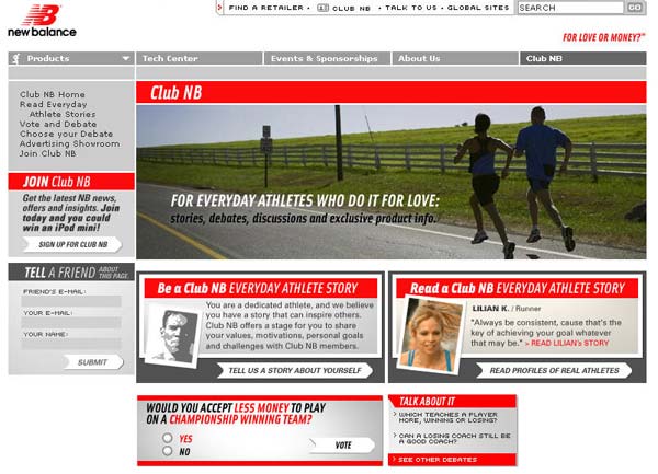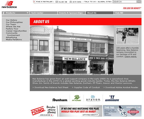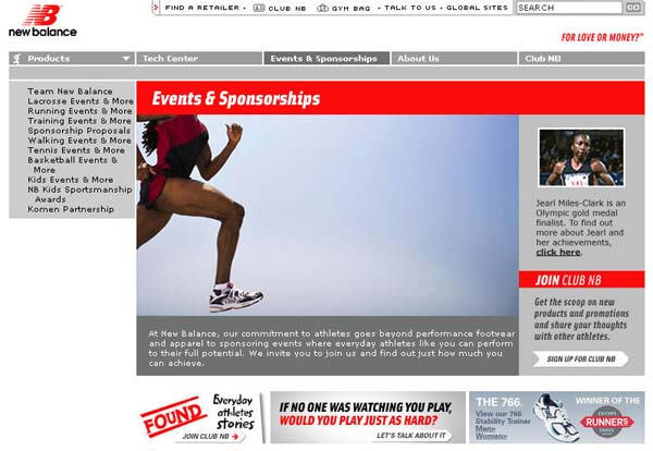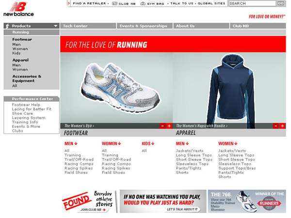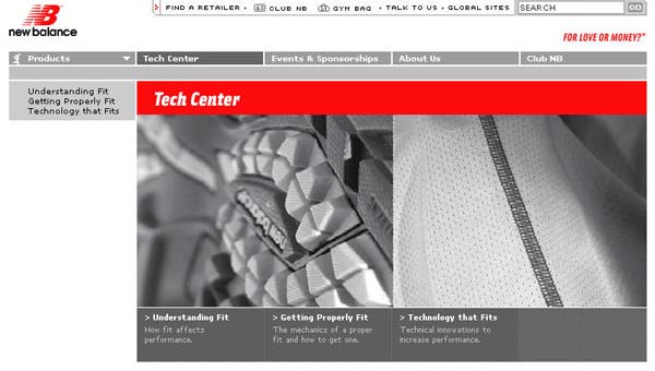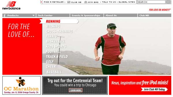 “新平衡”(美国著名运动鞋公司)想要一个网站能够反映和强化他们在运动鞋市场日益增长领导地位,而在同时它又能加强它们和消费者的关系。网站是为普通运动爱好者准备的,网站把产品作为核心内容部份,同时附加了在线客户服务,有用的工具和信息内容。