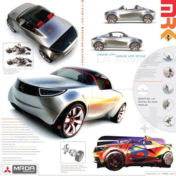“三菱Roadster Konzept”(三菱北美研发中心,Mitsubishi Research & Design of North America)。使用轮内马达的小型跑车。前面配备2个座席,后面设计有2个辅助座席。