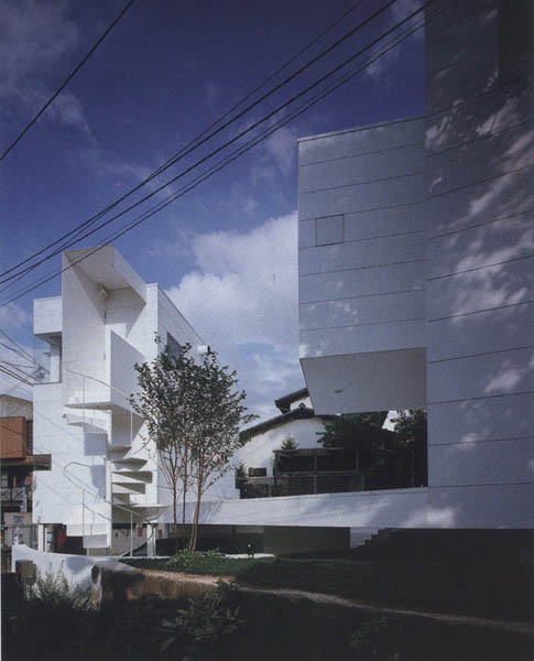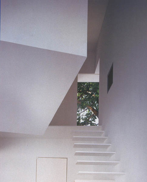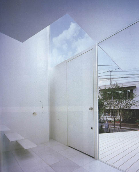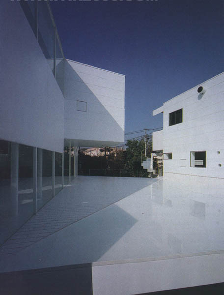 设计特点:这座为一位建筑师兼摄影师设计的住宅坐落在一处2895平方英尺的不规则坡地上,由一系列优雅而抽象的白色方盒子组成,轻薄的板材、紧张的线条为建筑带了一种二维的解读效果。建筑师利用坡地在地下建造了一座车库,同时也为上部的住宅和工作室提供了统一的钢框架平台。由于当地很少遭遇地震,因此结构体系就变得十分简单,18英寸厚的平台作为建筑的有机组成部分之一,顺应不规则的地形并调整了坡形台地的变化。住宅分为两部分,前面一座581平方英尺的建筑内包括底层的客厅和二层的摄影工作室,后部1216平方英尺的建筑作为主人的住宅。两座混凝土板建造的单体涂刷成白色,呈一定角度分布在三角形柏树甲板和反射水池的两边,从而保证了两栋单体的独立性和连通性。一部螺旋楼梯引导人们进入面向街道的工作室,而另一部直跑楼梯则将人们带进后部住宅的入口门厅和面向餐厅和厨房的两层通高起居空间。钢质楼梯板通往平台上方二层的卧室。建筑师通过0.1~0.3英尺的极薄金属板材来软化建筑体量并赋予其优雅的比例,就仿佛日本的传统折纸艺术。住宅室内通过玻璃屏风和地面天花板的高度变化划分出模糊流动的功能空间,并将储藏室布置在外部混凝土板和内部石膏墙板之间,从而使室内保持了明净简洁。