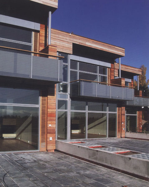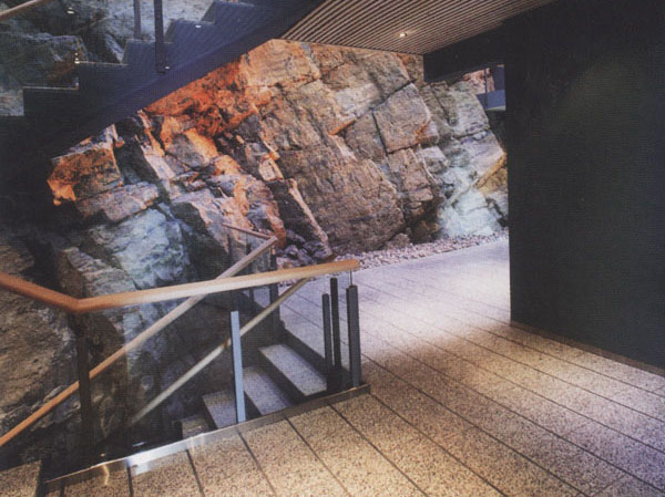 设计特点:这幢有六套住房的公寓住宅位于奥斯陆远郊一个宁静的山坡上,建筑物靠山而建,近三分之一的平面是切削山体而成,使建筑看上去像是“嵌”在山体之中。在底层停车场的里端保留着山岩的自然形状,既节省了造价又产生出自然质朴的别样感觉。公寓屋顶全部覆以草皮,从远处看上去像是山坡自然景观的延续。朝阳的立面采用落地玻璃窗以利提高室内的温度和自然光照亮度,建筑物进深里端还配有天窗以增强自然照明,采用当地的杉木板作为外墙饰面,铝合金窗框和茶色玻璃。由于业主是一家营建公司,所以保证了施工的精工细作,使建筑物有一种雕塑般的感觉。
