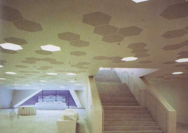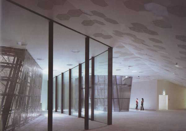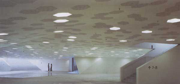 这座巨大的三角形建筑物像一块浸满水的海绵降落在巴塞罗那,建筑师将公共空间组织为三层,全部大胆地坐落在城市环形路上。由于广场空间与地面同一标高,参观者被吸引到巴塞罗那新的海岸区域——而这里曾经是发电站周围被废弃的土地。作为城市斜格网延伸出的一部分,会议厅和广场形成了部分人工平台,驾于城市繁华环行路和水处理厂之上。会议厅的建筑体量内插入了33个扭转变形的天井,使建筑在一层成为了半封闭的城市广场。在建筑的外围,天井显露出其变形的几何特性,而这种形式源自城市主要网格的叠加。在场地的上部,会议厅与广场之间的空间被压缩到极限,从而增加了建筑体量的模糊性。会议厅的地下是可以容纳3200名参观者的高贵而充满未来主义的休息大厅,从楼梯和外部天井射入的光线为空间带来了节奏感。地面通过四块美丽的陶瓷镶嵌“地毯”加以体现。在底层的休息厅,人们可以在室外天井里仰视上部扭曲变形的金属杆件,杆件之间每块三角形玻璃都有着独特的波形纹理,绝无重复。在这种模糊的、陌生的场所建造的项目无疑为巴塞罗那带来了一种新的城市形态语汇。