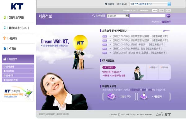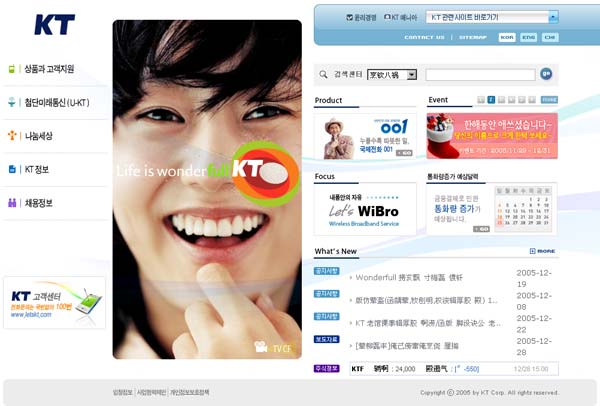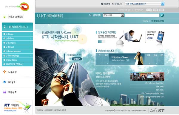 这个韩国电信网站的目标观众是公司和个人电信用户,既包括国内的,也包括国外的。位于汉城的这家公司是韩国主要的电信公司。它的成就,图象,新技术发展的展览,还有针对公司及个人用户的电信服务,都详细的列在了网站上。