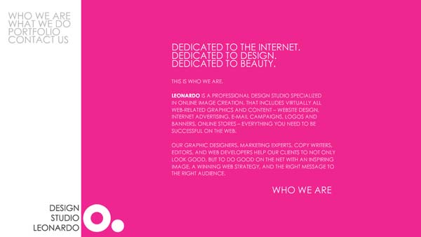 leonardo是一个专业的网络形象设计工作室。他们的设计事实上包括了几乎所有与网络相关的图片和内容——网站设计,网络广告,e-mail,LOGO和网络横幅广告,网上商店——一切你在网络上达到成功所需要的东西。
