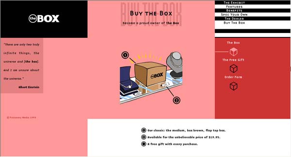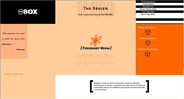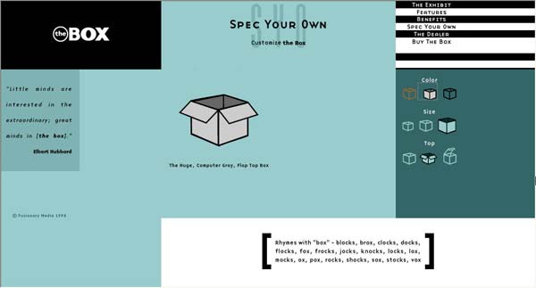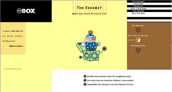 Box最初是在大力宣传推销联合媒体工程的提案的时候作为该提案的一部分被设计出来的。它的主要目的是向潜在顾客展示出这个工作室足以为网站带来生命力的设计技能和创造力。尽管box在颜色和几何图案风格上受顾客的营销材料的影响,但是这个充满创造力的团队把这次任务作为一次机遇不仅从中获得了乐趣,还通过这个在他们完全掌控之下的工程使每个人都融入其中。联合媒体没有得到原本预期的工作,而是被归入了一个更大的公司。在那之后他们必须呈交其它工程的计划提案,而这个工程则作为联合媒体的一个自我提升的板块继续运作。