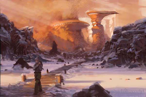 Dylan Cole,Matte Painting大师,参与了魔戒、夜魔侠等大师好莱坞巨片的MT工作。光看成品其实还远远不够,看看他的Sketch草图就知道了,一个MT高手的绘画基本功是多么的强,对于色彩与构成的掌握是多么的得心应手。