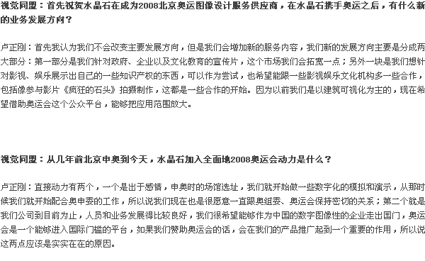 2006年8月2日,水晶石数字科技正式成为“北京2008年奥运会图像设计服务供应商”, 这家仅仅成立11年的新兴创意和科技企业加入2008奥运会的原因是什么?如何借助奥运平台拓展自己的业务?如果走向国际?视觉同盟近期采访了水晶石数字科技董事长和创始人卢正刚先生。