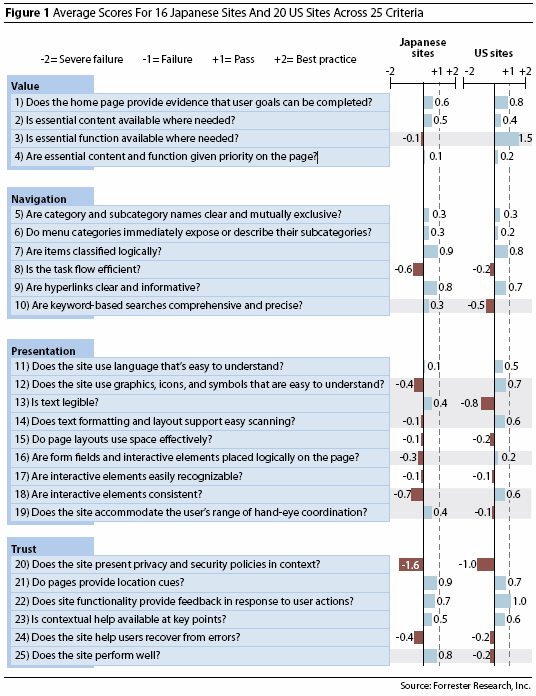 美国网站和日本网站到底有什么不同? 2005年Forrester Research 针对美国和日本网站的用户体验进行了一次网友调查,结果发现大部分网站都不能达到网友的预期,分别从每个因素来看,美国和日本网站则可说是“各有所长”。此次调查中四个关键指标分别为“价值”、“导航性”、“表现”、“可信任程度”。 参与测评的网站为汽车类,媒体类,零售类和旅游类。