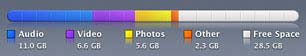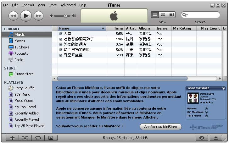 iTunes的主界面---苹果已经准备摒弃水晶风格了。色调偏向于灰色和低纯度的色彩,曲目库的分类目录甚至使用了黑色。这样的颜色应该会降低使用者的视觉疲劳感。
