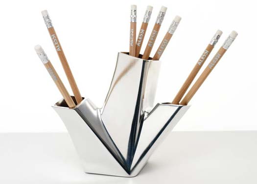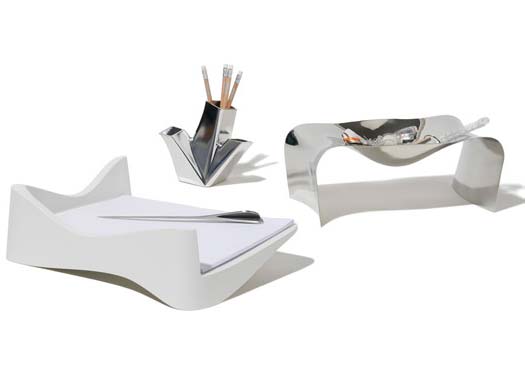 Alessi在今年的春夏季产品发布的时候,将其分成三个子品牌(ALESSI,A di ALESSI,OFFICINA ALESSI),他们从市场也得到了良好的反馈。现在推出了2006秋冬系列。上图为ALESSI底下的“Desktop Architecture“桌上文具产品,设计师为建筑设计师Hani Rashid (karim rashid的哥哥,没有他弟弟那样招摇)。“Desktop Architecture”包括的产品有铅笔桶TRINA,相框NARCIS,文件盒PARQ,小物品架SCUP,裁纸刀STILA。铅笔桶TRINA相框NARCIS文件盒PARQ小物品架SCUP裁纸刀STILA“Desktop Architecture”