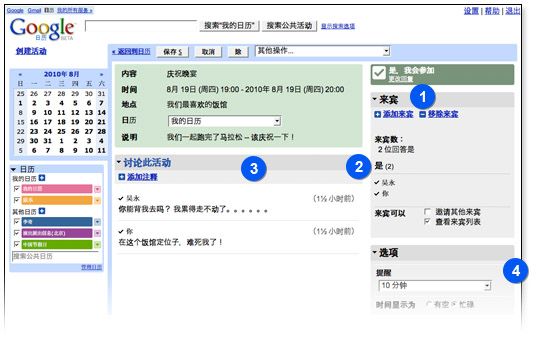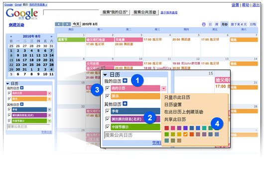 纵观全局 使用 Google 日历,您可以在查看自己的日历的同时查看朋友和家人的日程;快速添加保存在其他日历应用程序中的活动,还可以添加其他您在网上找到并感兴趣的活动。