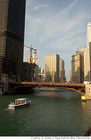 坐在船上,你感觉仿佛在城市的“大峡谷”底部滑行。游艇从21座桥梁的底下通过,你可以看见西尔斯大厦(Sears Tower)的黑色管道。你还可以欣赏巨大的“芝加哥商品市场”(Merchandise Mart)的装饰艺术。西尔斯大厦曾经是世界上最高的建筑物。在“五角大楼”出现之前,“芝加哥商品市场”是世界上规模最大的建筑物。