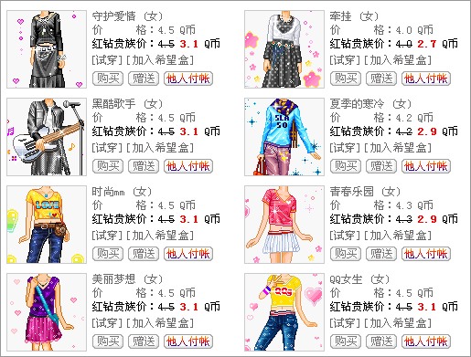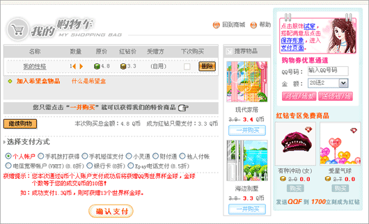 (http://qqshow.qq.com/ 需要先登录) 在这里设计者希望告诉用户:“所选的商品可以放入礼品盒,如果一起购买推荐的商品可以得到优惠,可以选择其他的支付方式,要如何购买,可以使用购物券,申请开通红钻有很多优惠……”