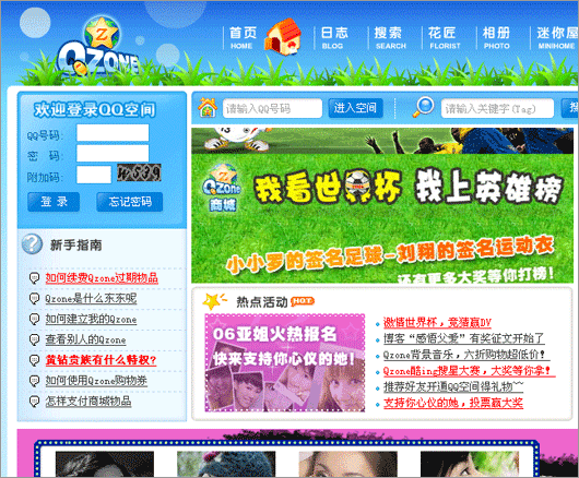 (http://qzone.qq.com/ ) 各个产品的首页左上角几乎都有登录框。登录框在告诉用户“来登录吧!”而这个页面上又展现了很多推荐的内容,比如:“我看世界杯 我上英雄榜”。这在告诉用户:“看,这个内容多有意思,进来看看吧!”类似的还有很多其他的推荐。那么用户到底应该先干什么呢?