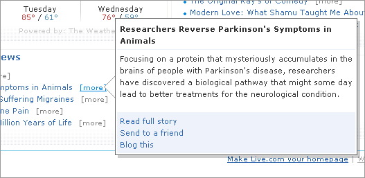一个来自live.com的设计:鼠标经过或点击more时,打开一个浮动的层,显示该文章的简介,并显示更多的相关操作。这些操作并没有直接显示在界面上,虽然那样做可以减少一次点击。