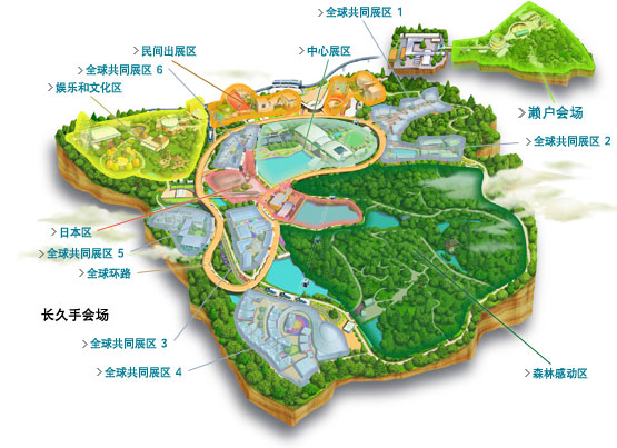 1. 主要行动途径上的无障碍设计 在基本计划中,最热闹的中心地区青少年公园设置空中回廊 「 全球环路 」 ,连接起每个大门、六个全球共同展区(公式参加者展览区)、民间展区等主要设施。把它作为无障碍的主要动脉,使得来访者上下移动少,可以安全舒适地参观展览。为此,特别对于环行路以及公共设施进行了整备,让所有的来访者感到圆满周到、心情舒畅。 原则上,还确保在上下线路要塞处,一并设置阶梯、升降梯或移动电梯,周到地对应各种来访者的需要。