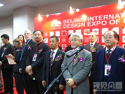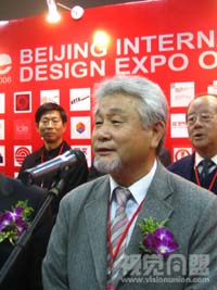 清华美院装潢设计系主任马泉副教授(左)视觉同盟主编廖翔(右)在清华美院展台前合影