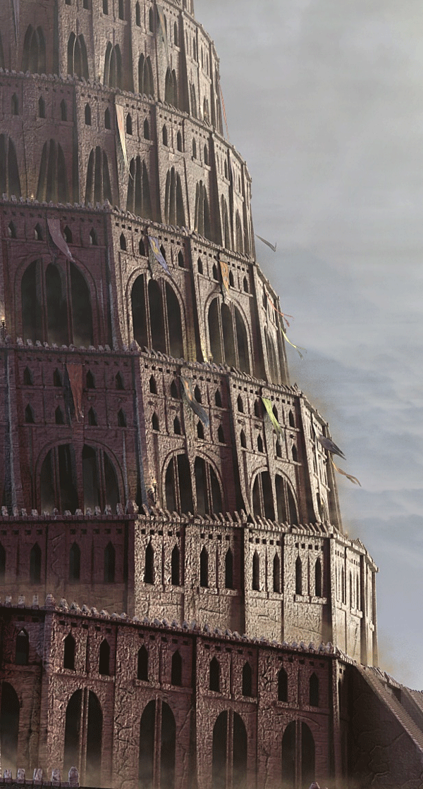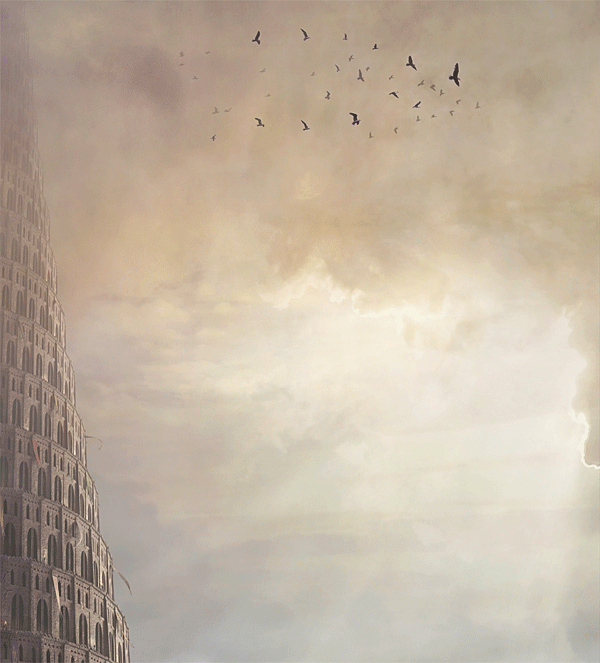 这幅画就是在巴别塔开始振动的描写。 故事情节介绍: 这是另一个没有确切记载的故事,5500多年前平和的一天,在文化中心巴比伦,所有的事都突然发生了变化,云突然开始奇怪的汇聚到巴别塔顶,然而人们还是过着他们的日常生活,他们并没有认识到,这座巴别塔已经触怒了神灵。最先发现异常的是那些动物们,在塔遭受打击前,它们已经感觉到一些异样,并在混乱前表现出一些恐慌。 一会儿后,天空开始出现不自然的形状,变的一边很亮而另一边却很暗。这正是神灵的显身。在这个时候,许多人们还是不知道发现了什么事,其他人则被这奇特的景观所吸引,然后一些架子开始晃动,但许多人还是没把这些当回事,没过多长时间,塔基地面开始剧烈振动,塔也开始晃动,最后坍塌了。