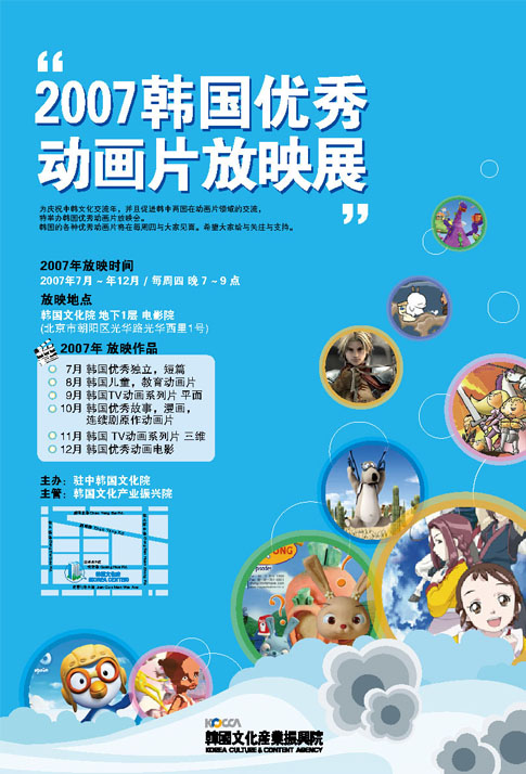 为庆祝中韩文化交流年,促进中韩两国在动漫领域的交流与合作,韩国文化产业振兴院将于2007年7月至12月在北京举办韩国优秀动画片展映会。届时韩国近年来各类优秀动画片将在每周四与大家见面。