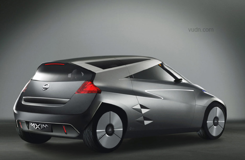 Nissan mixim概念车专为年轻司机设计,它抓住了年轻人的心理,不论是整体造型还是内部结构的设计都充满了动感时尚。它有两个发电机,还配有锂离子电池。长3700mm, 宽1800mm,高1400mm ,轴距2530mm ,总重量是950kg。室内采用了三个座位的布局。钻石造型为它增添了时尚元素,使它更具魅力。