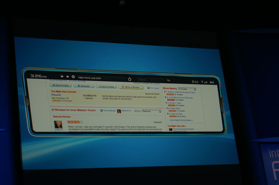 Intel 在 Intel Developer forum(Intel 开发者论坛)上展示了一个类似 iPhone 的移动网络设备范例,为了宣传他们下下一代的 Mobile Internet Device (MID) 和 Ultra-Mobile PC (UMPC) 平台-Moorestown(下一代为Menlow,计划明年推出),“Moorestown是Intel计划用来取代Menlow的一款新产品,它专为超移动PC所设计,包含了双核Silverthorne处理器和 Poulsbo单芯片芯片组。这些芯片可以与WiMax、Wi-Fi或3G手机服务模块相匹配,从而为希望在设备中加入无线支持的厂商提供了选择。Moorestown最大的优势就是体积小、低功耗。空闲状态下,一款采用Moorestown处理器的超移动PC,其功耗仅为Menlow设备的1/10。