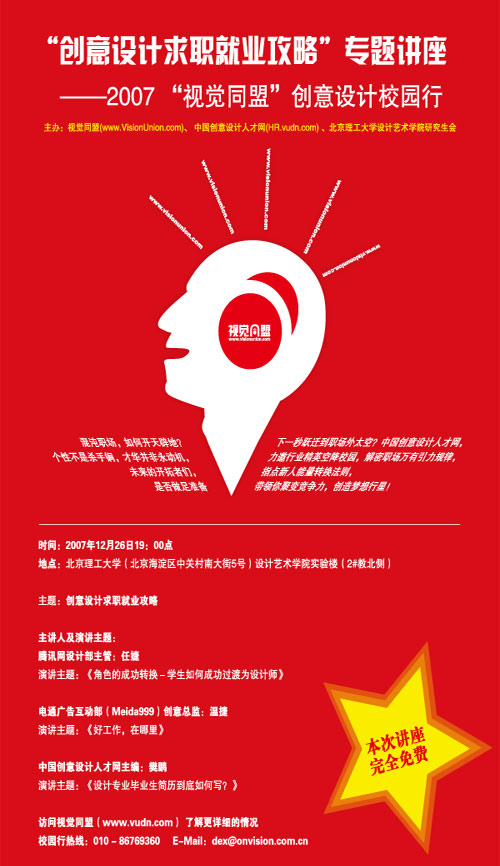 主办:视觉同盟(www.VisionUnion.com)、 中国创意设计人才网(HR.vudn.com) 、北京理工大学设计艺术学院研究生会(design.bit.edu.cn) 时间: 2007年12月26日19:00点