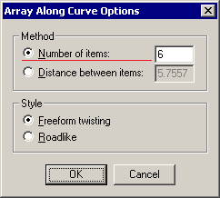 为了便于说明,在视图的空白处点击鼠标,取消所有选择。选择菜单 Transform > Array > Along Curve (排列到曲线),首先点击小圆,按鼠标右键,再点击大圆(可参考界面上方的操作提示),在弹出的选项窗口中,将数量改为6并确认,六个小圆就均匀排列在大圆上。