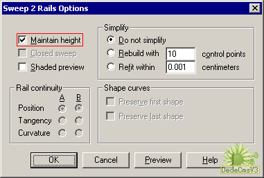 取消所有选择。按 (Surface > Sweep 2 Rails),首先点击上下两条曲线,再从左到右顺序选择三个截面形状,按右键结束。确认显示的三个点方向相同。如果某个点的方向相反,可以按F键在该点点击,将它的方向反转。