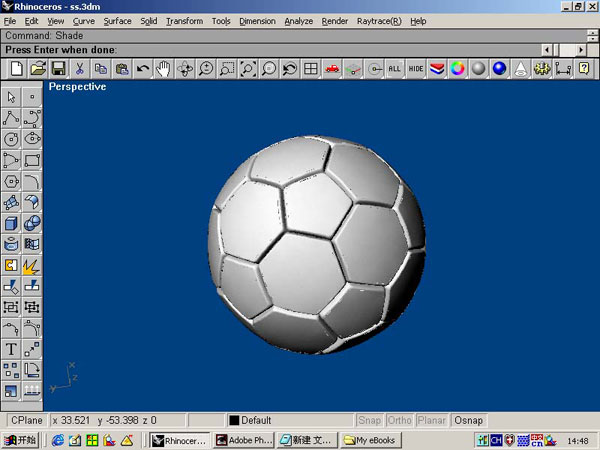 选择五边形面,对它进行Rotate 3-D旋转,使用拷贝方式。在Perspective视图,首先选球的中心点,再选六边形的中心点,也就是六边形垂直线的两边,在Top随便点个参考点,旋转拷贝120度。进行阵列用polar方式