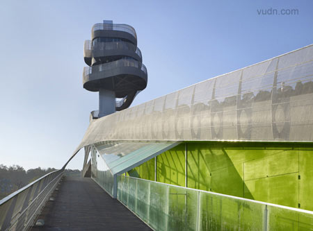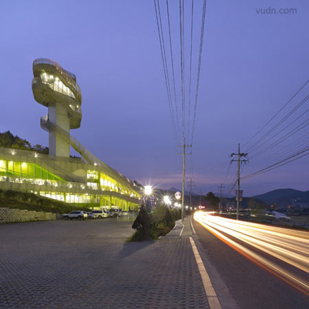 韩国Oktokki航天中心位于汉江流域的Ganghwa岛,由Mass Studies设计。Oktokki航天中心是一个主题公园,用地面积14854平方米。由侧重于空间科学和航天航空的教育展览、户内/户外互动的儿童设施组成。这个项目使3个潜在的不相容元素冲突与共存:山 ,大容量箱体类空间(展览厅) ,和塔(观察点) 。 是为了维持山区的连续性及实现扩大地形的思想组合而成。