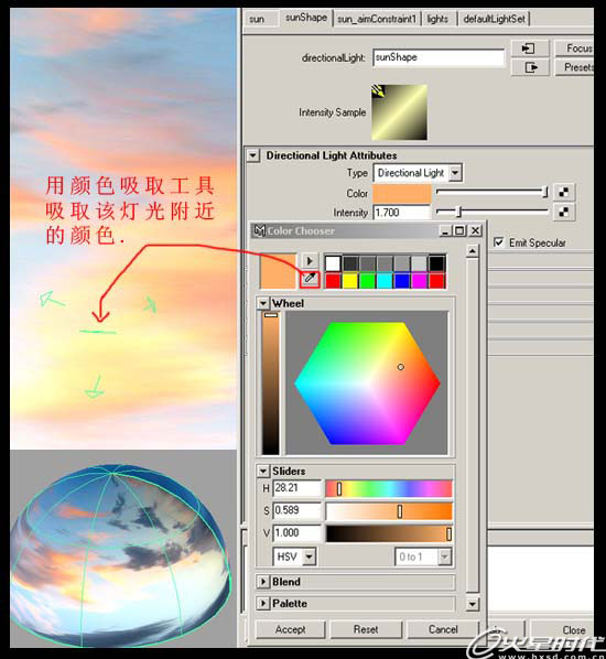 我使用了一个平行灯作为主光源,16盏平行灯作为全局光源,其中8盏为天光,8盏为地光。然后我找了一张天空的贴图,连接到一个半圆的nurbs的color上,制作出一个天空的环境球,再把视图对准灯光的照射正面,吸取真实天空的颜色,看下图: