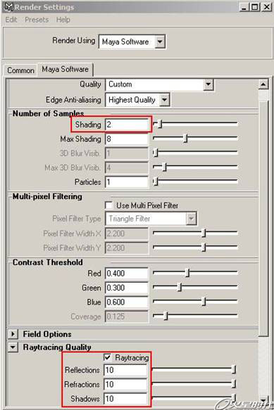 我使用的是Maya software。也许有很多朋友喜欢直接选择Production品质,但是做静祯的时候,我一般不会使用Production的品质,因为 Production品质默认是打开Multipixel-pixel Filtering的,这项参数会对整个图象进行过滤,柔化,模糊图象。如果使用这项参数会降低图象的清晰度,所以做静祯的时候我个人不喜欢打开这个参数。一般我只是提高Shading(全局表面采样)和Raytracing(光线跟踪)的参数,其他一般保持默认, 这样可以得到很不错的效果,又省下不少渲染的时间。