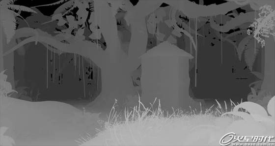 这样可以更接近地得到真实天空的颜色。 为了丰富地面的变化,我还加了几盏不起照明作用的聚光灯,用黑白通道的树贴图连接到灯光的Color上,用于模拟树的影子打在地面上的效果, 再为场景过暗的地方加上辅助灯,但能减少的尽量要减少灯光的数量,不可盲目地加, 否则只会增加渲染的时间而未必得到很好的效果。