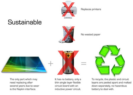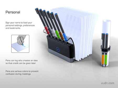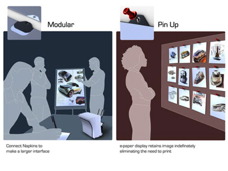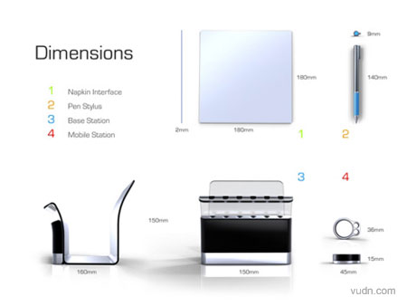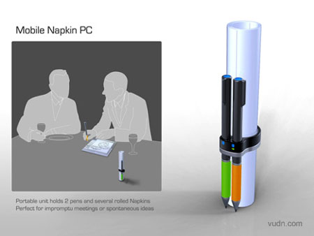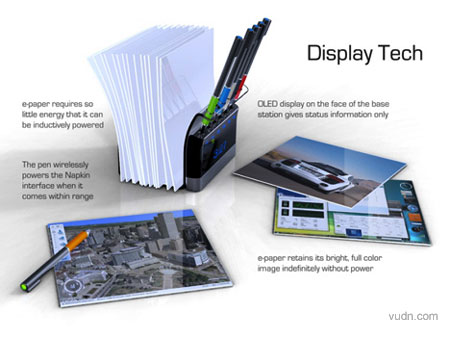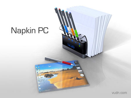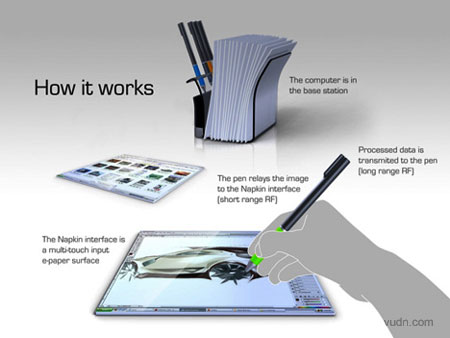 Napkin概念电脑专门为经常开会的商务人士(尤其是设计),包括一个主机和几个led显示终端,几个输入笔,这样在小组讨论时候大家都可以方便用“笔”画出自己的想法便于大家讨论或者共享信息,另外还有大的图板显示模板。