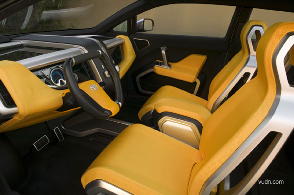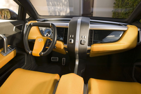 丰田A-BAT皮卡概念车呈现了混合动力、多功能性、宽敞空间和动感造型等多种概念,该车由丰田的高级产品策略组与其位于加利福尼亚基地的研究设计中心Calty共同研发设计,带有明显的“美式肌肉”风格。内饰配件大多宽大粗旷,同时搭配很多金属元素以体现出力度: