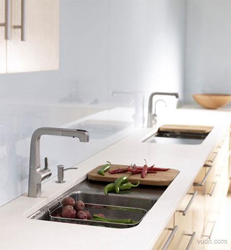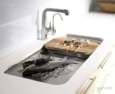 Anne Kitzmiller设计的多功能厨房水槽,包括一个金属固定的案板,在水槽边直接架设木质案板,可以形成一个有效率的工作流程