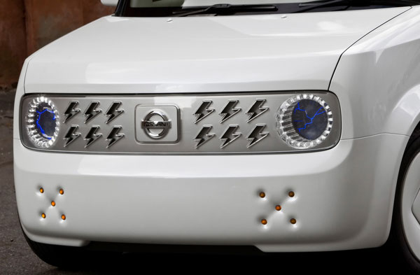 一直以来,Nissan Cube便展现其与传统汽车截然不同的设计概念:方正、极简而不对称;本著这个基础,原厂為其导入全新的EV电池动力系统,并针对车身内外加以改造,化身成為Denki Cube Concept概念车。闪电纹路的水箱护罩成為车头的焦点所在,而头灯和保险桿在设计上也有所修正。车尾部份,招牌不对称尾窗设计依旧保留,不过在尾灯和后保桿等处则同样作出区别。