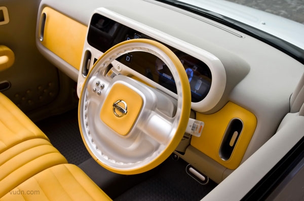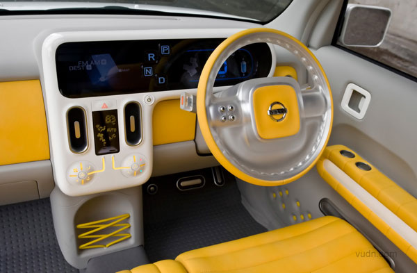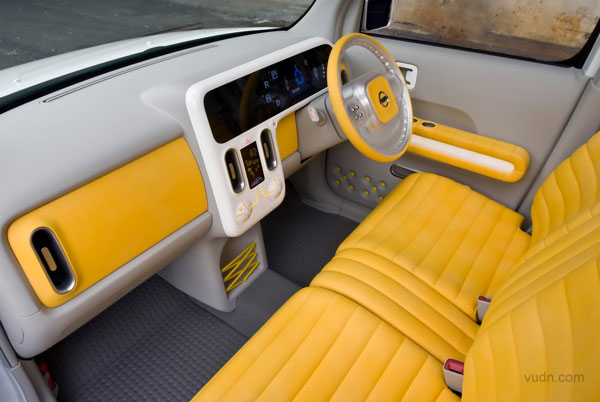 设计师尝试在Denki Cube Concept的车室内部,创造出宛若自家空间般的愉悦感受。一别於市售Cube的三排座椅设定,Denki Cube Concept仅採用传统的双排座椅规划;同时原厂将轴距延长238mm,以容纳额外的鋰电池模组。而在操驾介面上,科技感十足的仪表板和中控台,及全新设计的方向盘,也為Denki Cube Concept车室创造更多乐趣。