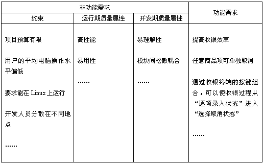 * 约束。要开发出用户满意的软件并不是件容易的事,而全面理解要设计的软件系统所面临的约束可以使你向成功迈进一步。约束性需求既包括企业级的商业考虑(例如"项目预算有限"),也包括最终用户级的实际情况(例如"用户的平均电脑操作水平偏低");既可能包括具体技术的明确要求(例如"要求能在Linux上运行"),又可能需要考虑开发团队的真实状况(例如"开发人员分散在不同地点")。这些约束性需求当然对架构设计影响很大,比如受到"项目预算有限"的限制,架构师就不应选择昂贵的技术或中间件等,而考虑到开发人员分散在不同地点",就更应注重软件模块职责划分的合理性、松耦合性等等。 * 运行期质量属性。这类需求主要指软件系统在运行期间表现出的质量水平。运行期质量属性非常关键,因为它们直接影响着客户对软件系统的满意度,大多数客户也不会接受运行期质量属性拙劣的软件系统。常见的运行期质量属性包括软件系统的易用性、性能、可伸缩性、持续可用性、鲁棒性、安全性等。在我们的超市系统的案例中,用户对高性能提出了具体要求(真正的性能需求应该量化,我们的表1没体现),他们不能容忍金额合计超过 2秒的延时。 * 开发期质量属性。这类非功能需求中的某些项人们倒是念念不忘,可惜很多人并没有意识到"开发期质量属性"和" 运行期质量属性"对架构设计的影响到底有何不同。开发期质量属性是开发人员最为关心的,要达到怎样的目标应根据项目的具体情况而定,而过度设计(overengineering)会花费额外的代价。