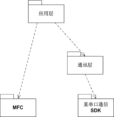 其中,采用哪些现成框架、哪些第三方SDK、乃至哪些中间件平台,都应该考虑是否由软件架构的开发视图确定下来。图6展示了设备调试系统的(一部分)软件架构开发视图:应用层将基于MFC设计实现,而通讯层采用了某串口通讯的第三方SDK。
