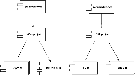 在说说约束性需求。约束应该是每个架构视图都应该关注和遵守的一些设计限制。例如,考虑到"一部分开发人员没有嵌入式开发经验"这条约束情况,架构师有必要明确说明系统的目标程序是如何编译而来的:图7展示了整个系统的桌面部分的目标程序pc-moduel.exe、以及嵌入式模块rom- module.hex是如何编译而来的。这个全局性的描述无疑对没有经验的开发人员提供了实感,利于更全面地理解系统的软件架构。