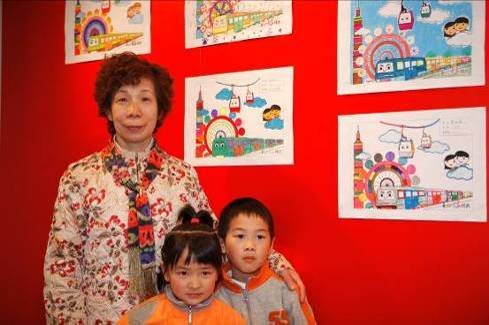 家长带着获奖儿童前来领奖,背景墙即为获奖儿童的作品展示墙。
