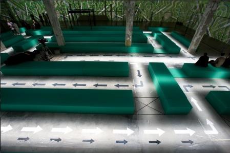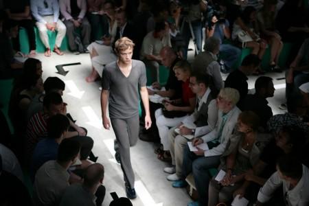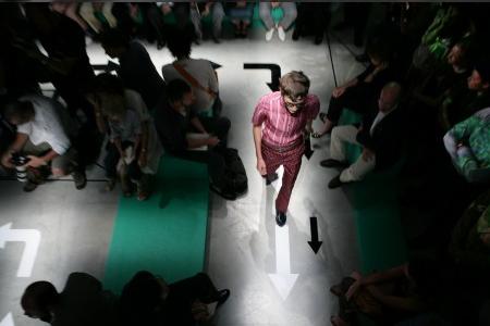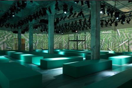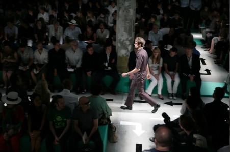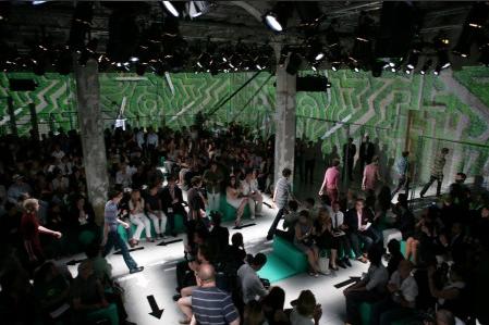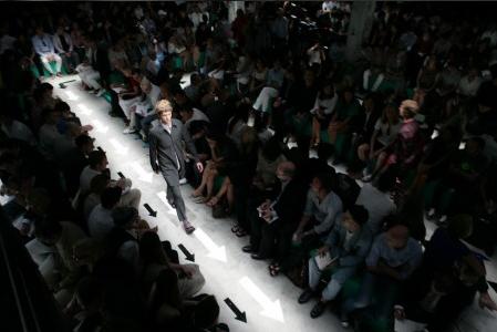 PRADA 2008春夏男装发布会依旧在意大利时尚之都——米兰举行。今年的男装会场以硬朗的矩形作为设计元素,绿色作为主色。模特儿在这样的会场走cat walk时,不禁让人以为他们在草丛中漫步。路中的箭头使模特们在交错的通道上不会走错方向。同时,曲折迂回的路线能让更多的观众近距离的欣赏模特儿身上的服装。